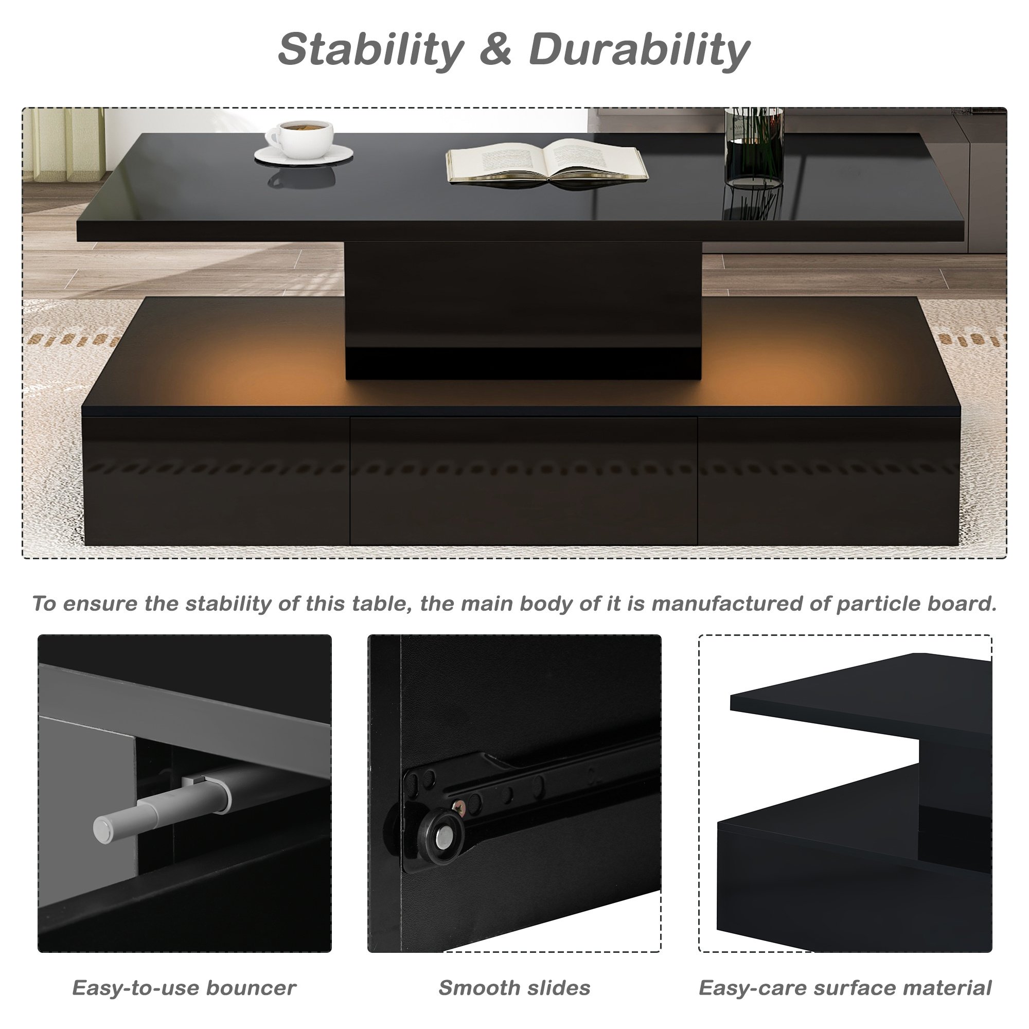Sturdy Material & Easy AssemblyVery strong particleboard with solid hardware, this table will last a long time in your home. The installation method is also very simple. By following our instructions, you can easily complete the installation within half an hour.Product detailsProduct TypeCoffee TableTop ShapeRectangleTop ColorBlackTop MaterialParticle boardTop Finish ApplicationVeneerBase ColorBlackBase MaterialParticle boardBase Finish ApplicationVeneerBuilt-In LightingYesWeight Capacity143lbsDrawers IncludedYesCountry of OriginChinaTable Top Thickness1.18inchClearance - Floor to Bottom0inch